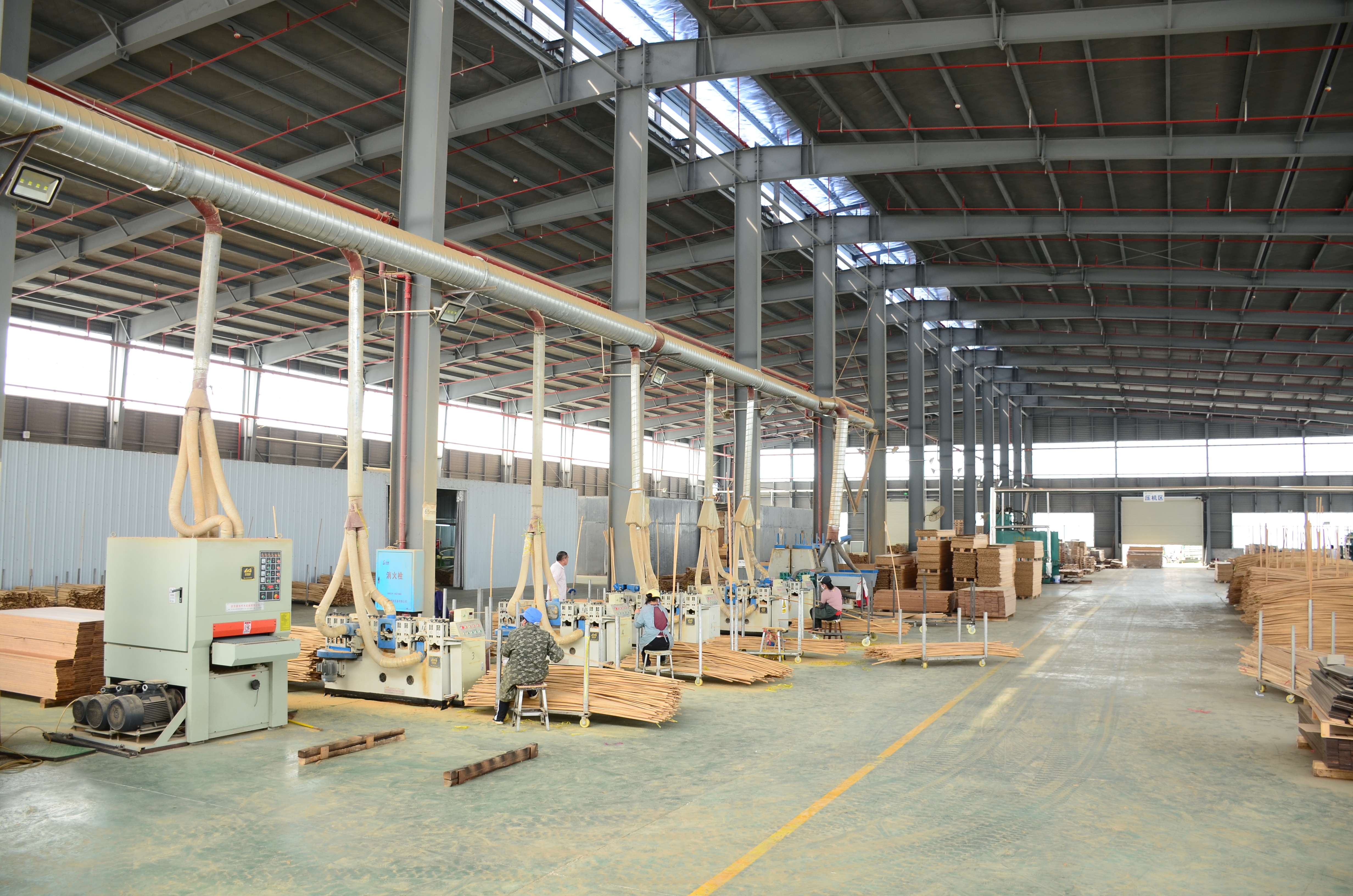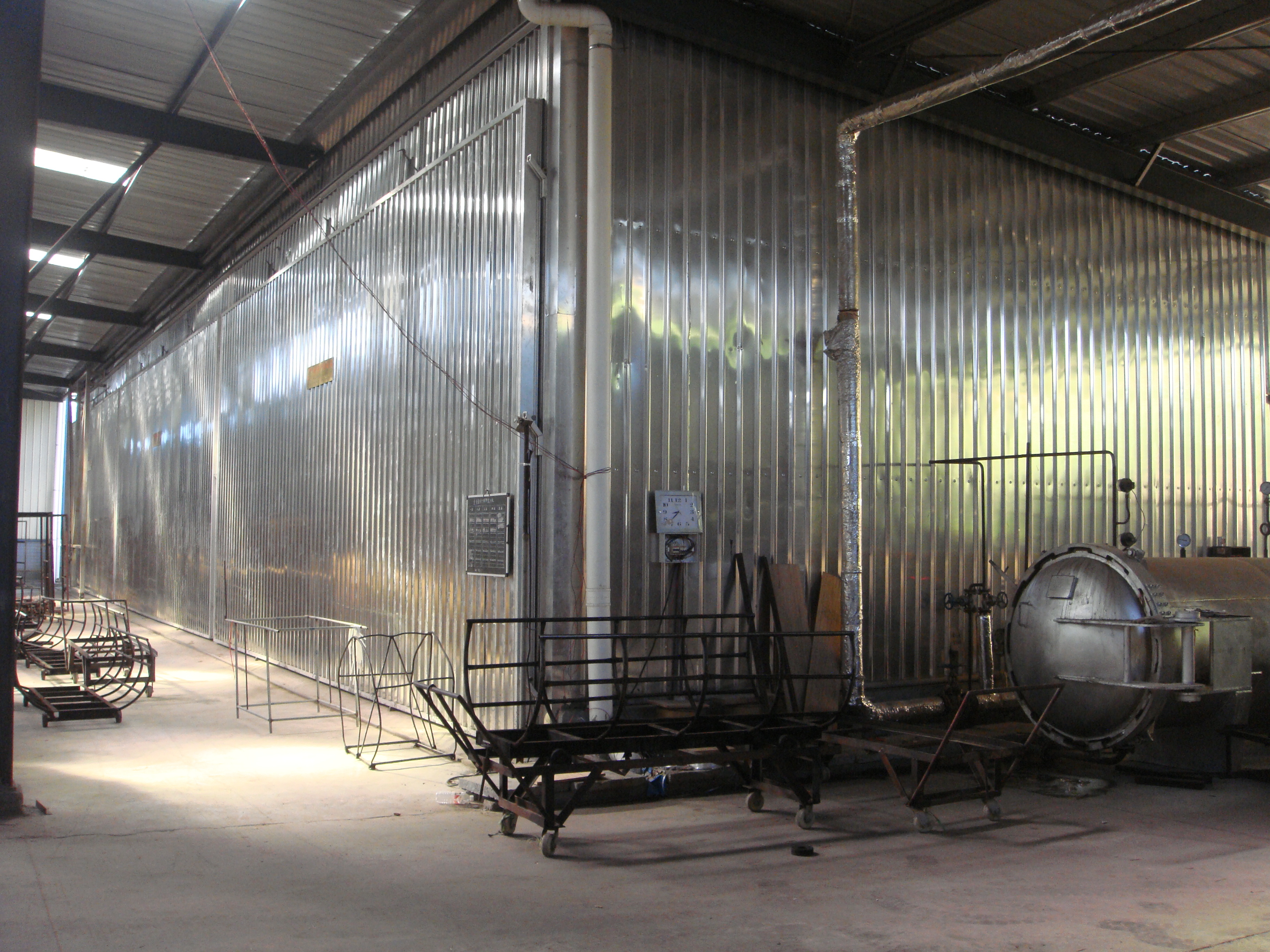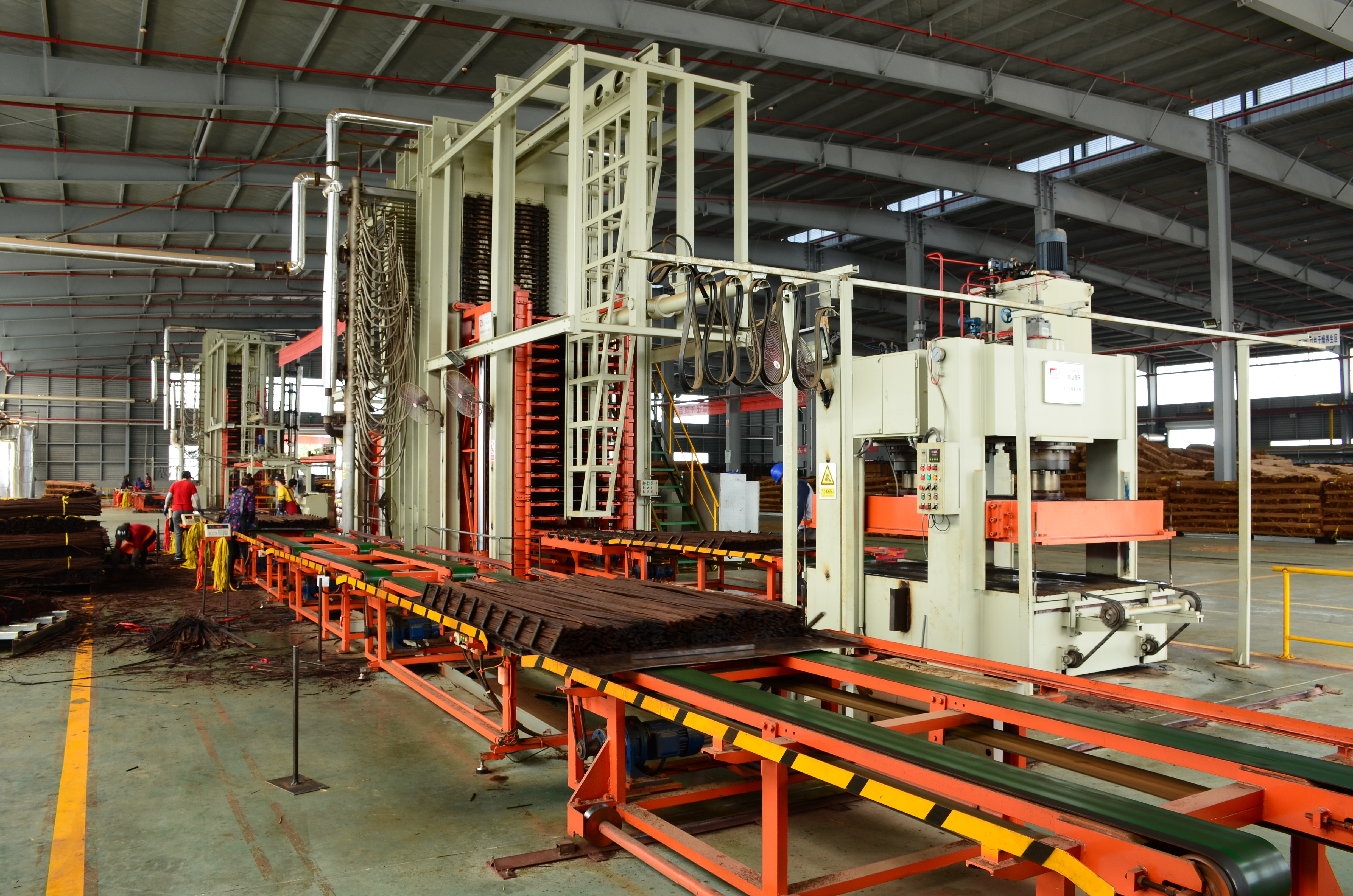 將竹絲束放在碳化爐中,碳化溫度為100~105度,壓力為0.3~0.4MPa,時間為3~5H。使竹材中澱粉、蛋白質分解,使蛀蟲及黴菌失去營養來源,同時殺死蟲卵,處理後竹材成古銅色或咖啡色
