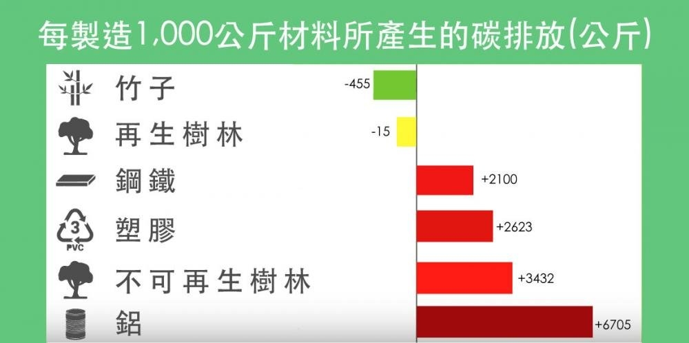 ▲竹子的碳足跡與再生林、不可再生林相比,對地球都相對友善